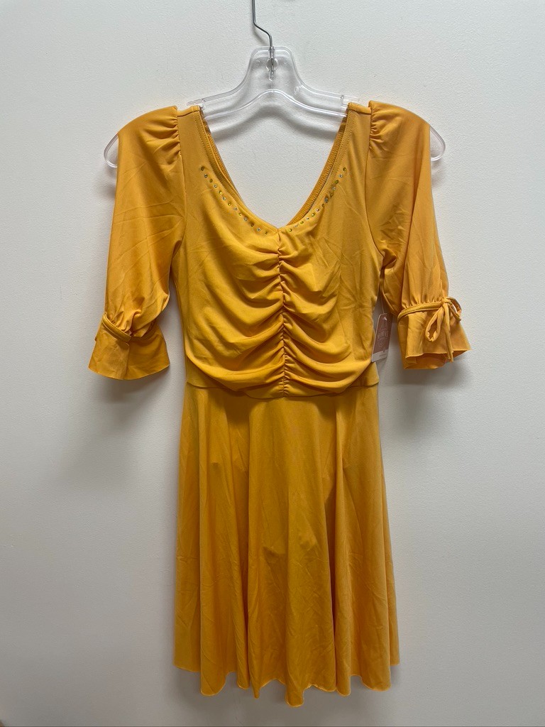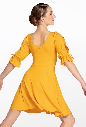 Matte jersey dress has half sleeves with cutoutsRuched front bodiceDecorative ties at the neckline and sleevesAttached briefs